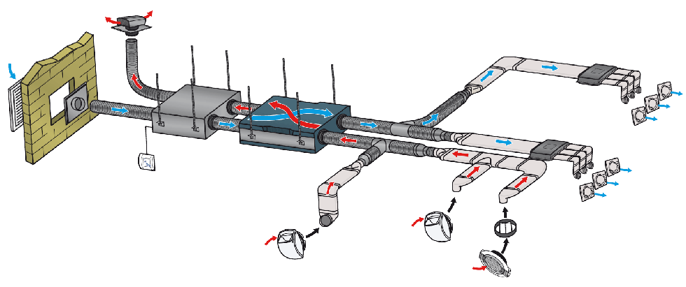 Enfin, il y a les entrées d'air situées à l'extérieur du bâtiment. Ces entrées d'air assurent l'apport d'air frais dans le système.