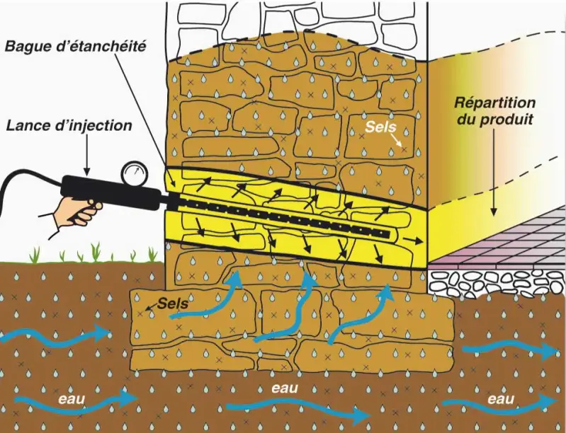 - Injection sous pression d’une résine imperméabilisante dans les pores de la structure maçonnée.