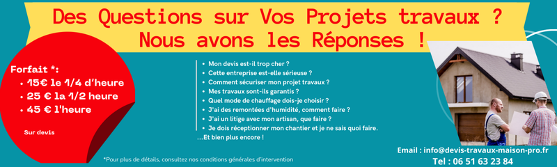 Notre service de conseils en travaux est conçu pour offrir des réponses claires et précises à toutes vos préoccupations. Que vous vous demandiez si votre devis est trop cher, comment sécuriser votre projet, ou quel mode de chauffage choisir, nous sommes là pour vous aider. Notre expérience dans le domaine des travaux et de la rénovation, nous permet de partager nos savoir-faire avec vous.